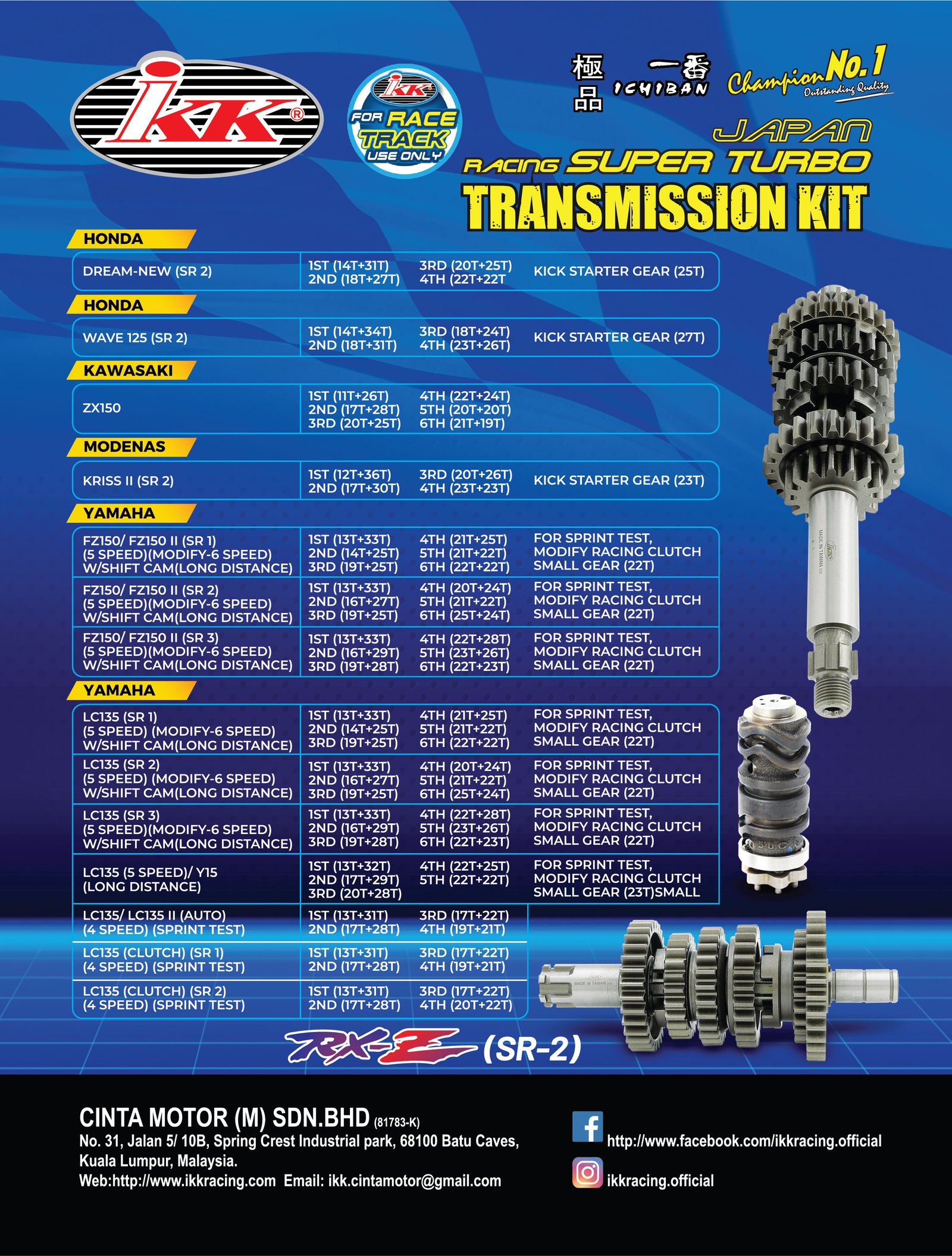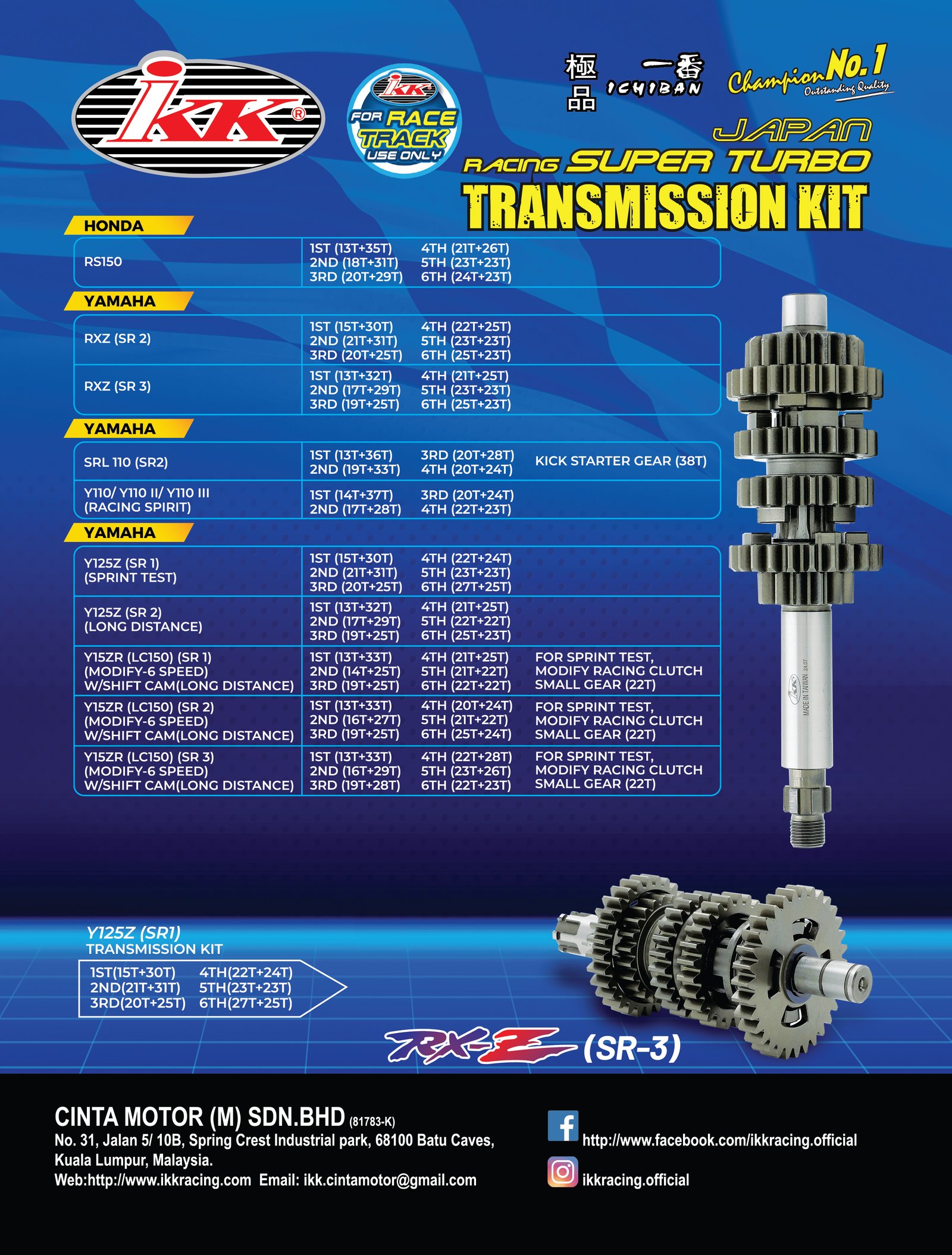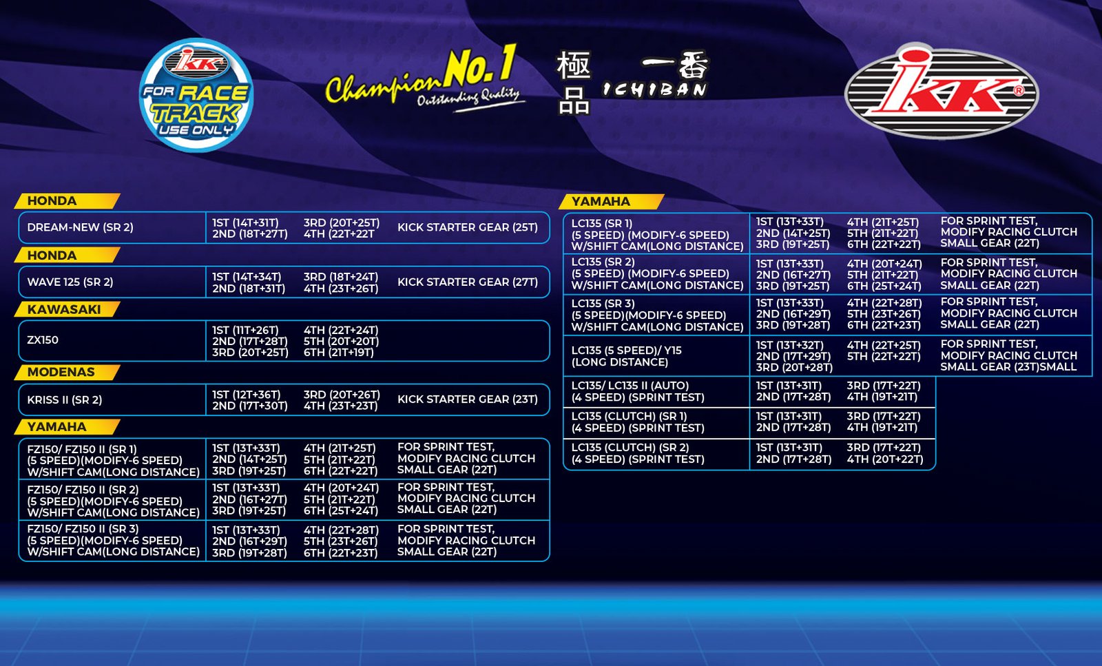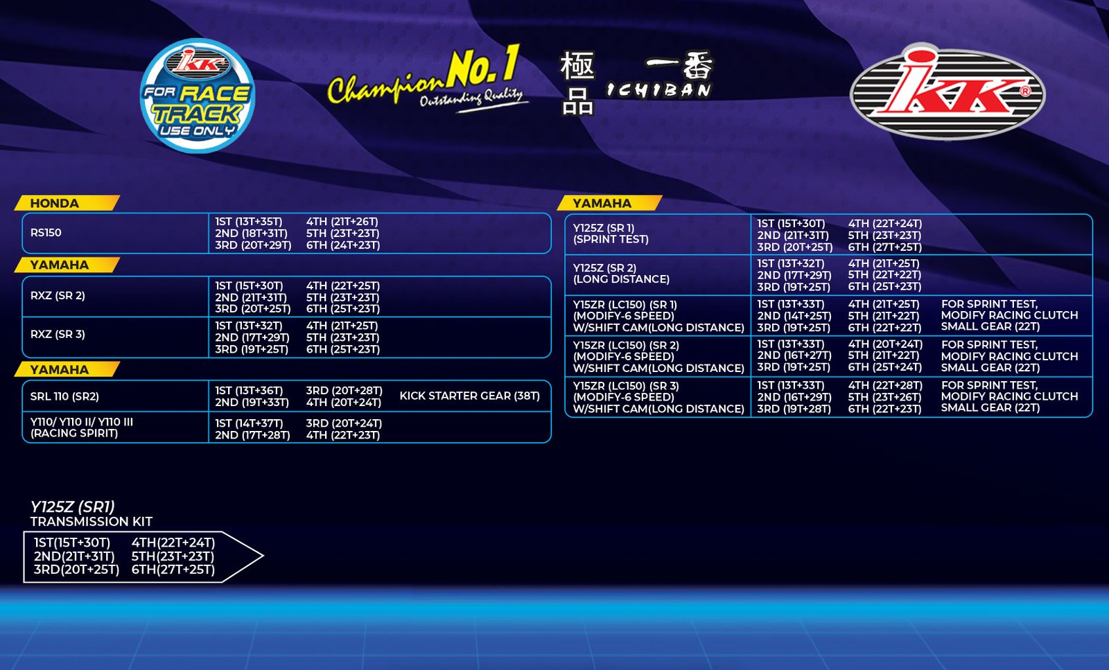 Selain agak berbaloi dan mempunyai nilai tambah dalam pembelian anda, pakej yang disediakan oleh IKK turut menyediakan saiz berbeza mengikut model RXZ anda. Bagi model RXZ SR-2 saiz yang diberikan adalah 1ST – 15T/30T, 2ND – 21T/31T, 3RD – 20T/25T, 4TH – 22T/25T, 5TH – 23T/23T dan 6TH – 25T/23 T.