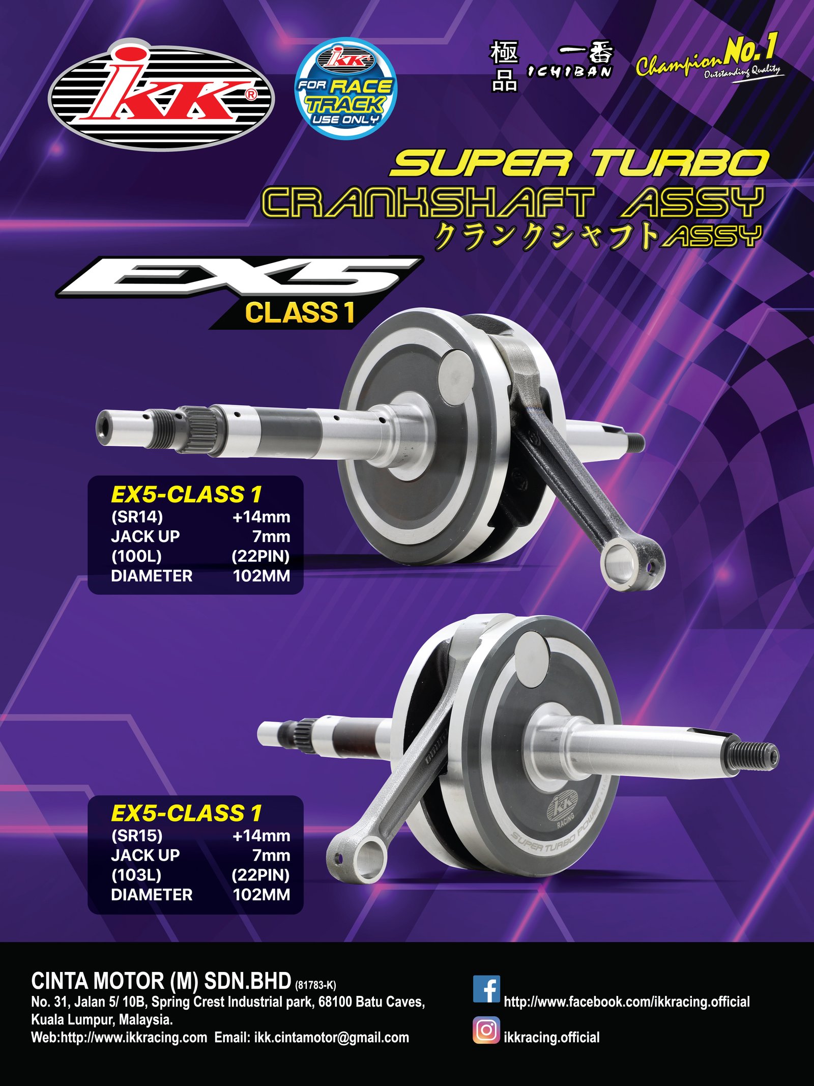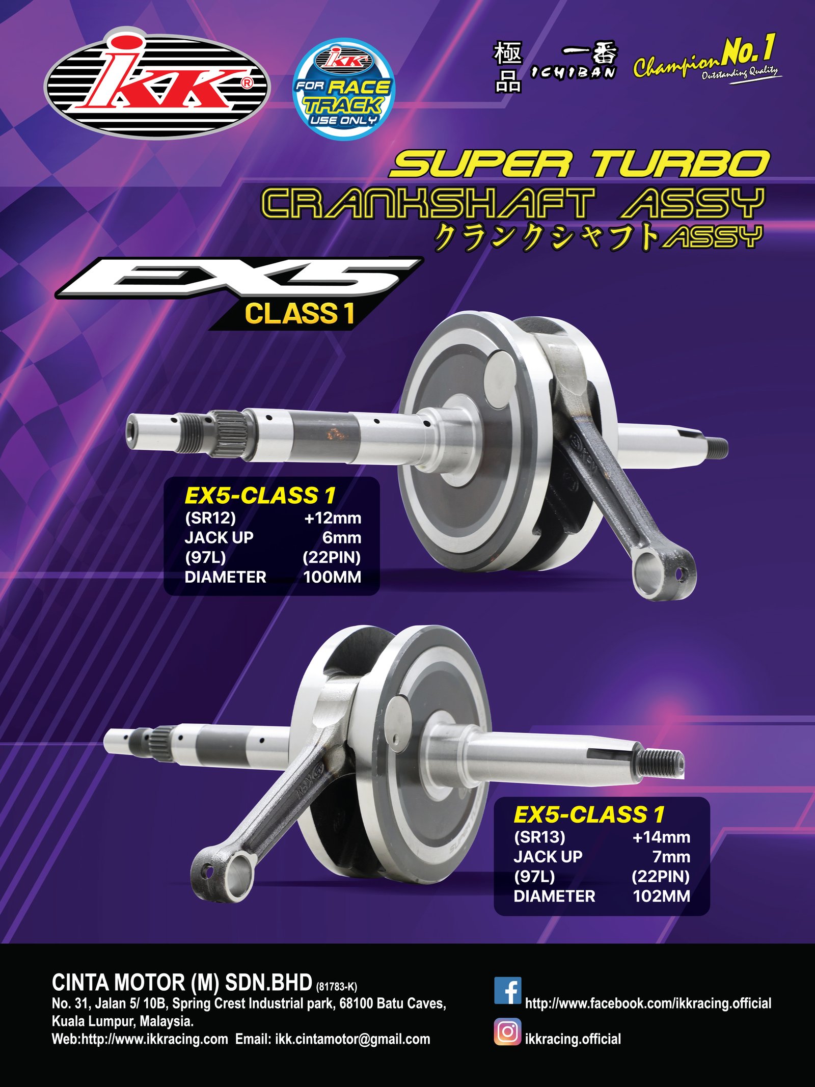 IKK Racing Super Turbo Crankshaft bagi model Honda EX5 Dream diedarkan oleh Cinta Motor (M) Sdn Bhd beroperasi pusat perniagaan di Batu Caves, Kuala Lumpur. Bagi yang mahukan maklumat lanjut mengenai produk IKK Ichiban ini, boleh hubungi: