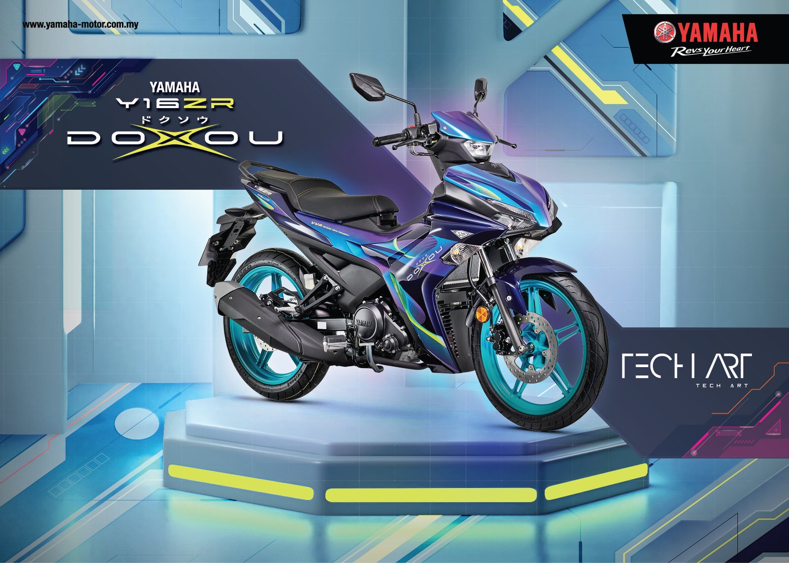 Untuk info, ‘Tech Art’ DOXOU Yamaha Y16ZR menampilkan liveri moden dan tercanggih, dengan rim sukan berwarna cyan baharu pada kedua-dua roda hadapan dan belakang yang menyerlahkan motosikal yang sudah kelihatan sporti.