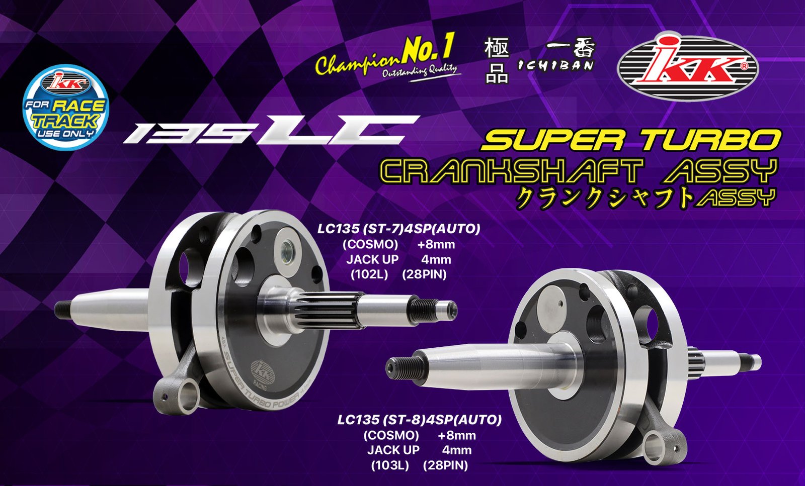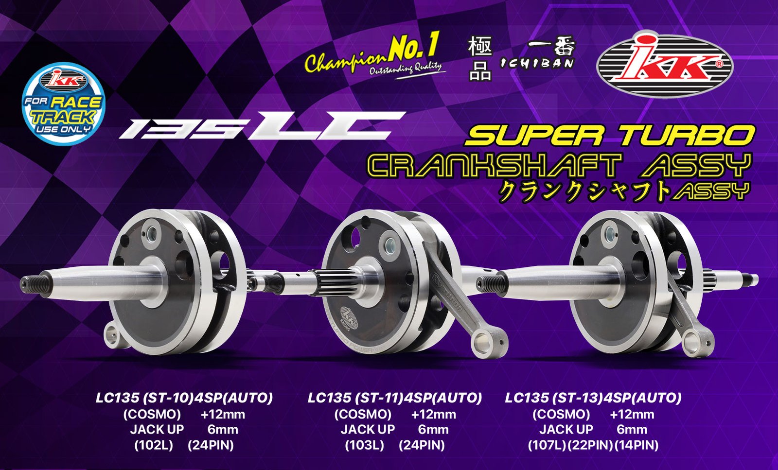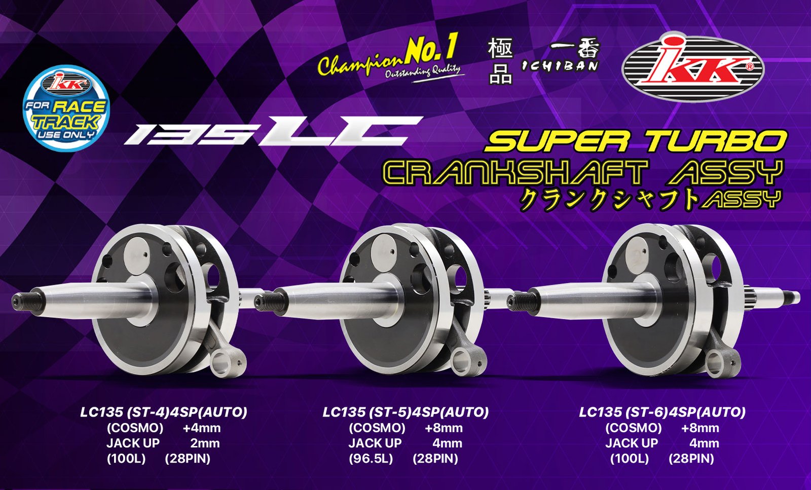 Berikut adalah pakej Crankshaft bagi model Yamaha 135LC yang disediakan oleh IKK. Antaranya pakej LC135 dari IKK yang tersedia ialah (ST-7) 4SP (Auto) Cosmo +8mm Jack Up 4mm (102L) (28PIN), LC135 (ST-8) 4SP (Auto) Cosmo +8mm Jack Up 4mm (103L) (28PIN), LC135 (ST-10) 4SP (Auto) Cosmo +12mm Jack Up 6mm (102L) (24PIN), LC135 (ST-11) 4SP (Auto) Cosmo +12mm Jack Up 6mm (103L) (24PIN), LC135 (ST-13) 4SP (Auto), Cosmo +12mm Jack Up 6mm (107L) (22PIN) (14PIN).