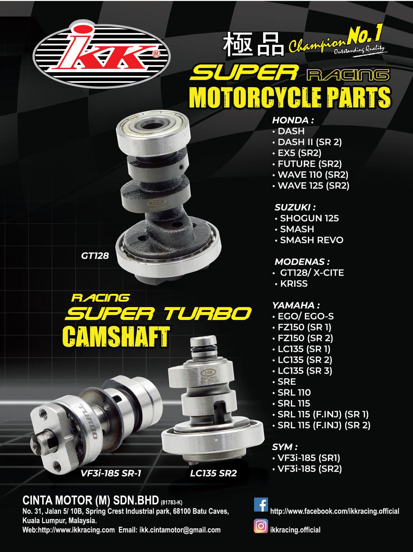 IKK Racing memperkenalkan tiga model Camshaft – Racing Super Turbo bagi tiga varian motosikal popular masa kini iaitu model Modenas GT128, SYM VF3i-185 SR1 dan Yamaha LC135 SR-2 (khusus bagi jentera sprint test).