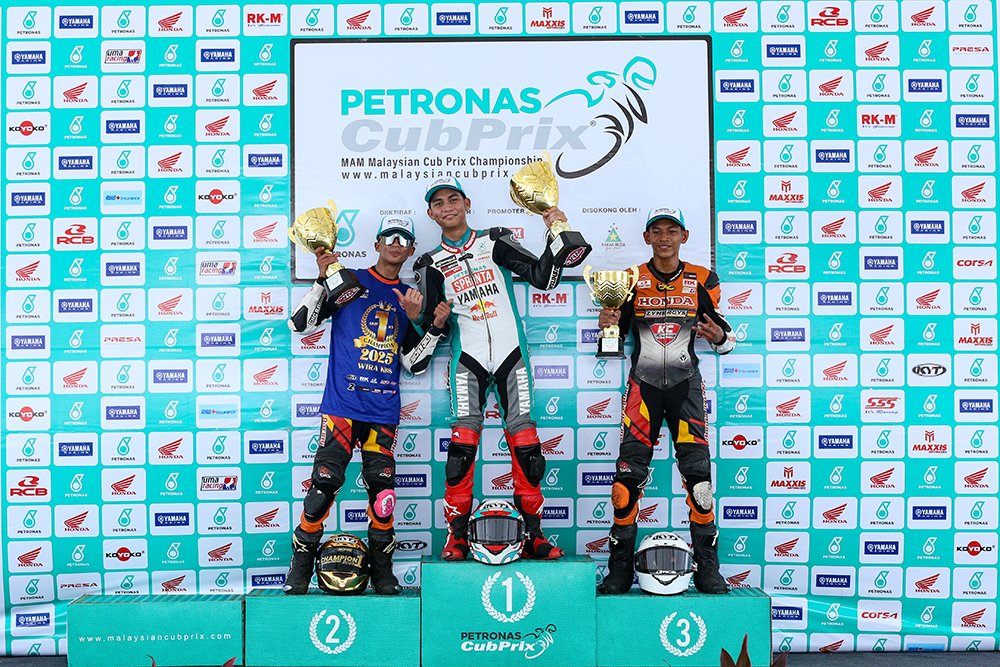 Pusingan ke-9 Kejuaraan PETRONAS MAM Malaysian Cub Prix 2025 yang berlangsung di Stadium Negeri Pulau Pinang menyaksikan pertarungan hebat antara pelumba-pelumba ternama negara. Dalam kategori utama CP150, Kasma Daniel Kasmayudin dari pasukan PETRONAS Sprinta Yamaha Maju Motor menampilkan persembahan mantap untuk muncul juara, sekali gus mengesahkan kedudukan naib juara keseluruhan musim 2025. Sejak permulaan perlumbaan, Kasma pantas menguasai kelompok hadapan diikuti oleh Azroy Hakeem Anuar (Honda Estremo Yuzy Racing) dan Danial Syahmi Ahmad Shahril, rakan sepasukan Kasma.
